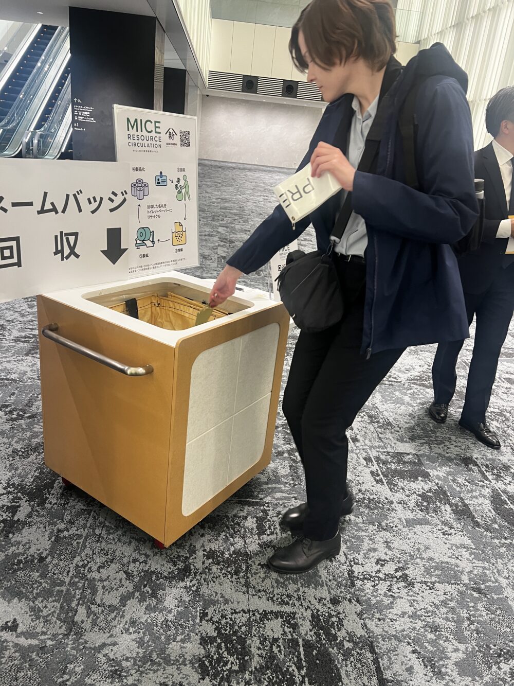 会場の出口付近に設置させていただいた弊社のオリジナルリサイクルボックス(可動式)に、参加者の皆さまに使用済のバッジを入れていただき、回収をさせていただきました。
