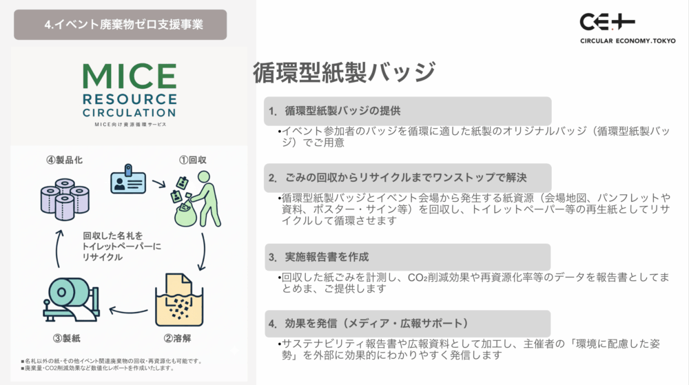 イベントでは必ず必要となるものの、様々な理由から廃棄されがちなネームバッジ。今回のようにリサイクル可能な紙製のバッジを使い、回収サービスを行い、再生品になるまでを保証させていただく弊社サービスにより、環境負荷を下げ、カーボンニュートラルなイベント運営にお役に立つことができます。