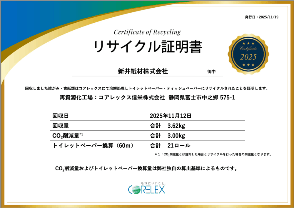 回収してメーカーに送られた古紙はリサイクル証明書が発行されますので、運営会社様にお渡しいたしました。証明書には回収量とともに、CO2削減量も明記されています。